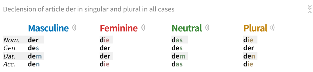 德语中的无论是表示人还是物的名词都可以分为阳性{maskulin}、阴性{feminin}和中性{neutral}三种,词性的变化会遵从一致性原则体现在修饰名词的冠词和形容词上。阳性对应der,阴性对应die,而中性对应das,这三者又会随着数和格发生响应的变化,如下表所示(要开始背表格了):