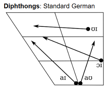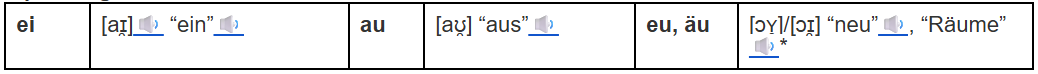 德语中的双元音一共有4个,分别是ei(ai,ay,ey)/au/eu/äu。[12]中给出的音标如下图所示,其中eu/äu的音标在Netzverb Dictionary中一般标注为[ɔɪ̯],ai/ay/ey的读音与ei保持一致。